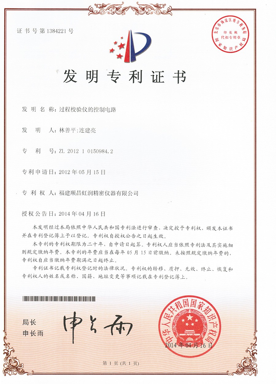 過(guò)程校驗儀發(fā)明 發(fā)明專(zhuān)利證 |