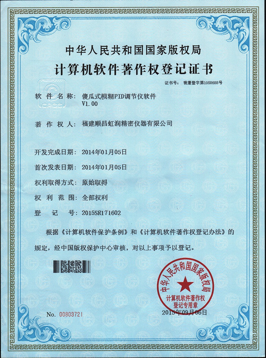 虹潤公司人工智能算式與模糊PID算式是虹潤公司應用自主知識產(chǎn)權開(kāi)發(fā)的新一代智能溫控儀表,產(chǎn)品榮獲一種人工智能調節器及其調節方法(專(zhuān)利號:2016107742425)、模糊PID控制儀及控制方法(專(zhuān)利號2015109378814)、一種智能化控制器及自整定方法(專(zhuān)利號2016103155465)、閥門(mén)自動(dòng)、手動(dòng)無(wú)擾動(dòng)操作控制方法及裝置(專(zhuān)利號2007101540083)4項國家發(fā)明專(zhuān)利,NHR人工智能模糊PID調節器(版權登記號2009SR044371)傻瓜式模糊PID調節儀軟件V1.00 (版權登記號2015SR171602)2項軟件著(zhù)作權。